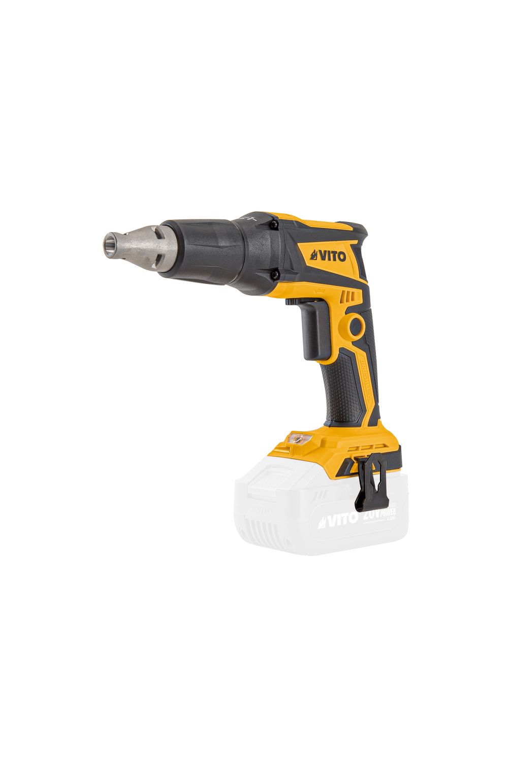Aparafusadora sem escovas para gesso cartonado, compatível com a bateria comum 20V. Encaixe 1/4", regulação de profundidade e rotação reversível para fixações precisas em placas de gesso.